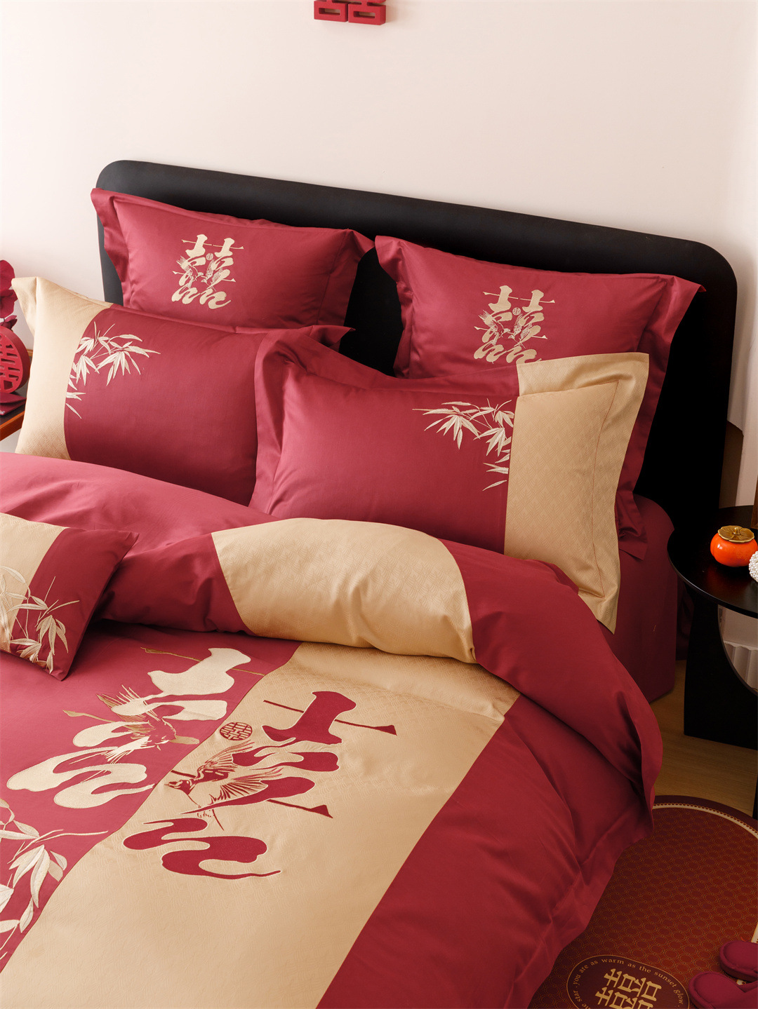 镶嵌着流光溢彩的喜字图案,巧妙融合竹子之清雅高节与喜鹊之欢腾报喜,象征爱情如竹常青,幸福似鹊登高。甄选优质面料,以精湛工艺雕琢,每一寸细节皆蕴含深邃祝福与无尽浪漫,爱巢洋溢着温馨与喜悦。