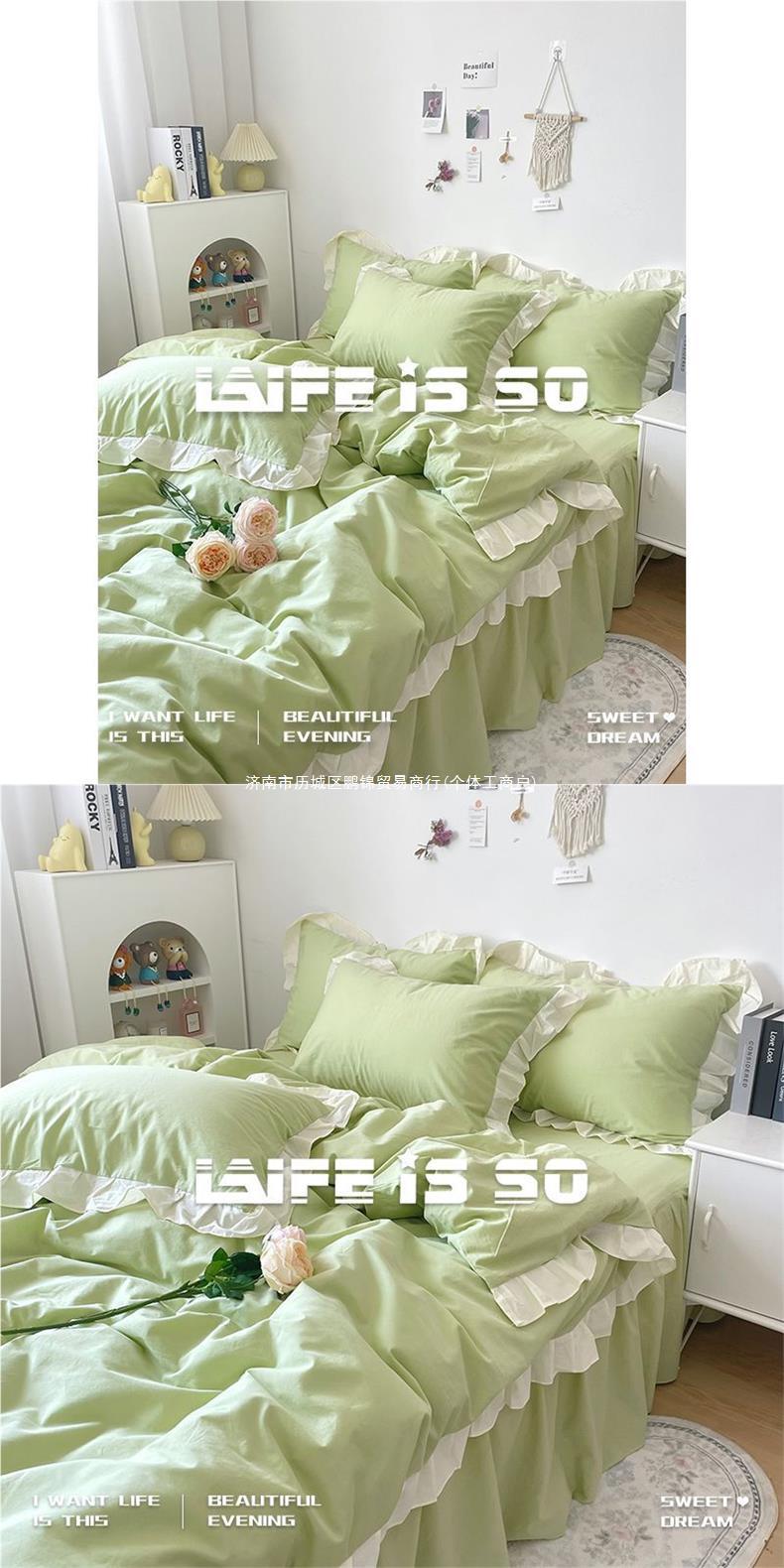 ins韩版浅绿色纯色水洗棉床品四件套花边被套床单人学生床三件套